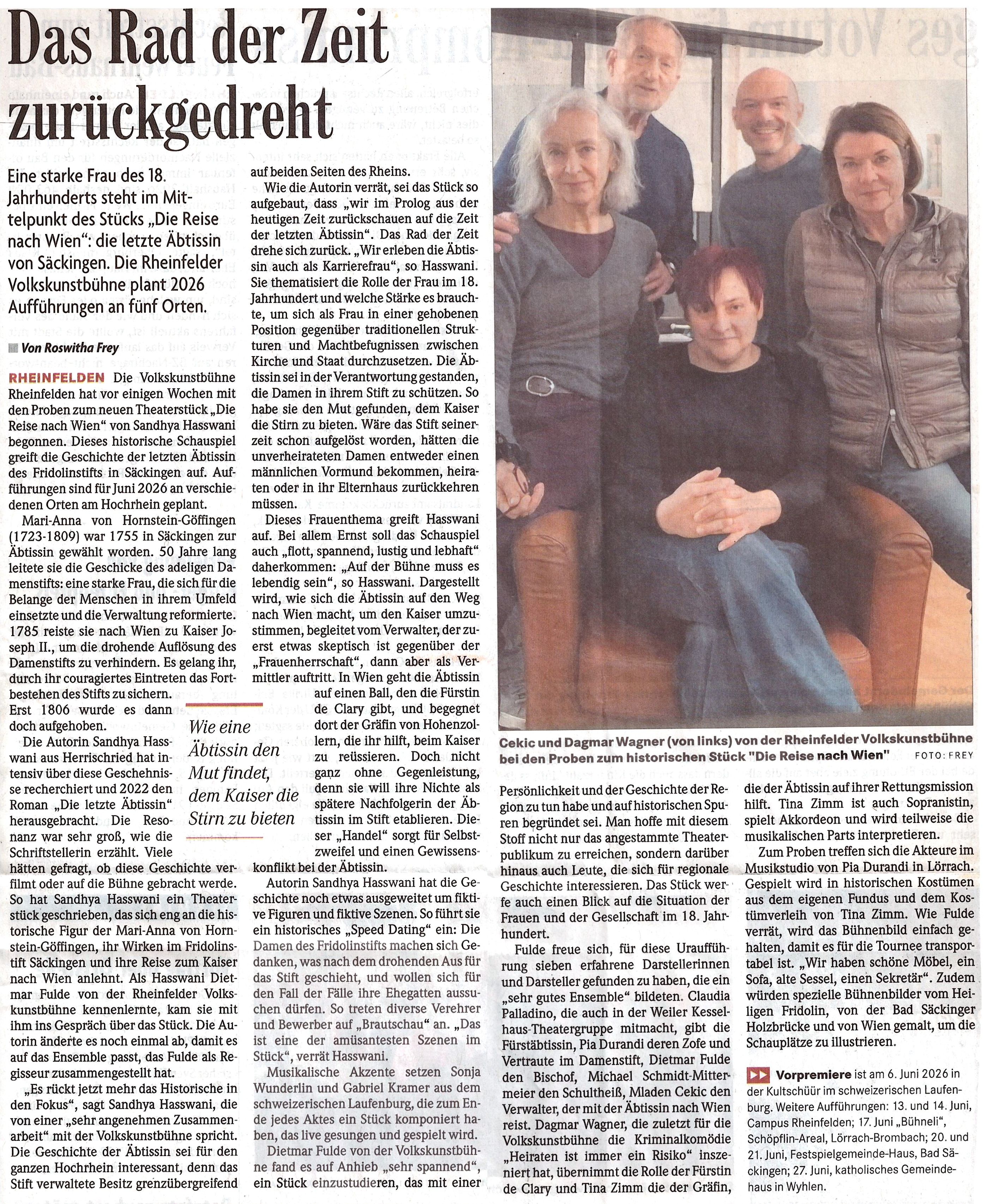 Neben den SchauspielerInnen der Volkskunstbühne wirken auch Sonja Wunderlin und Gabriel Kramer aus Laufenburg mit. Das Musikerduo Wunderkram hat eigens drei Lieder für das Theaterstück komponiert. Nach der Uraufführung in der Kultschüür am 6. Juni 2026 geht „Die Reise nach Wien“ auf Tournee und wird noch an vier weiteren Orten am Hochrhein aufgeführt.